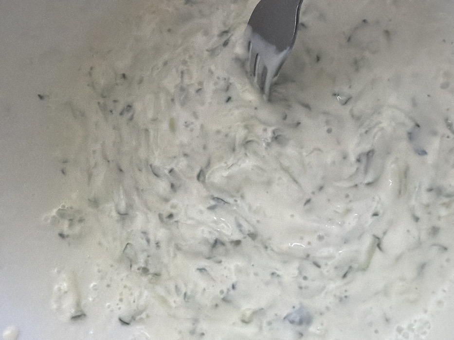 A creamy, opaque, off-white substance, consistent with a dairy-based food product, fills the frame. Irregularly shaped, dark green to grey flecks, consistent with finely chopped or grated vegetables, are suspended throughout the substance. The texture exhibits minor inconsistencies, including small aggregations and slight surface bubbling on the left side. A silver-colored metal fork, specifically its tines and a portion of its shaft, is partially submerged into the substance in the lower right quadrant. The substance is contained within an unidentified light-colored vessel. No people are visible. The scene is observed from a direct overhead perspective. The location is Pentre, United Kingdom.