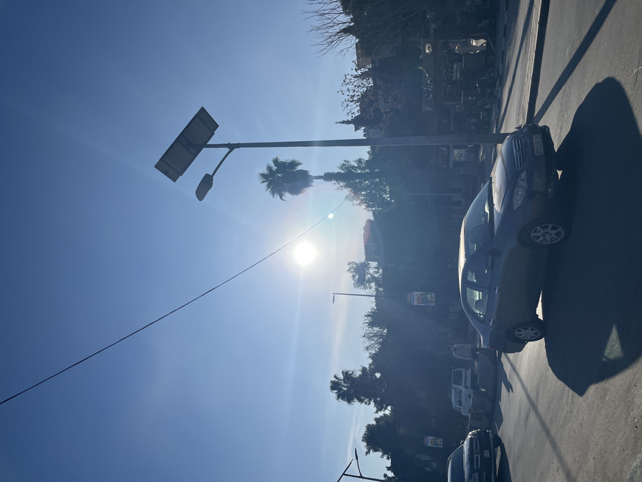 A street scene with a car parked on the right side. The sun is high in the sky, making the sky look blue. There are trees and buildings along the street. A street light with a solar panel is visible. Other cars are parked further down the road. The shadows are long and stretched out.