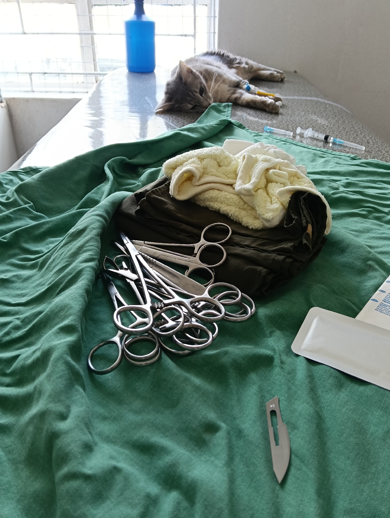 gray tabby cat lying on a treatment table with an IV line in its leg. A blue bottle, two syringes, and a pile of surgical instruments are also on the table, which is covered with a green cloth. The objects on the table include a stack of dark green and beige fabrics, as well as a sealed surgical packet and a loose scalpel blade. The photo was taken in Nairobi, Kenya.