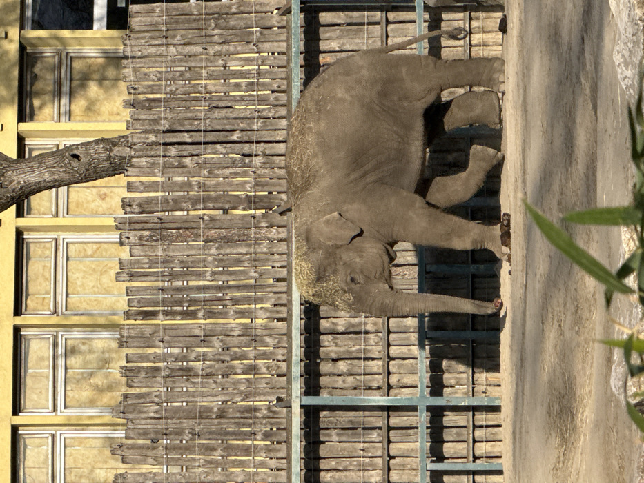 The image displays an outdoor enclosure within the Budapest Zoo and Botanical Garden, located in the City Park (Városliget) of Budapest, Hungary. A single, large, grey-skinned elephant, consistent with an Asian elephant, is depicted walking from left to right across a sandy or dirt ground. The elephant has a substantial amount of hay or straw scattered across the top of its head and along its back. Its trunk extends downwards, with a small, reddish, irregular object positioned directly beneath its tip on the ground. Several dark, elongated, irregular objects, possibly pieces of wood or enrichment items, are visible on the ground near the elephant's front and hind feet. In the mid-ground, a two-part fence system separates the elephant from the background. The lower section features a light blue metal framework supporting vertical wooden slats or logs. Above this, a taller, more rustic fence is constructed from vertical, uneven wooden logs secured by horizontal wires. Behind the fences, a light yellow building is visible, featuring multiple white-framed windows that appear to be covered or obscured from the interior with a lighter material. To the right side of the frame, a thick-trunked, bare tree stands, casting distinct shadows across the yellow building and portions of the fence. The lighting indicates strong, directional sunlight, suggesting a bright daytime setting. The immediate foreground shows out-of-focus green foliage, likely plant leaves or grass.