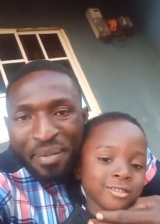 A man with a beard and a plaid shirt is holding a young boy. They are smiling at the camera. The man has his arm around the boy's neck, but does not appear to be choking him. There is a window behind them, and what appears to be an electrical box on the wall. The background appears to be a wall with some texture.