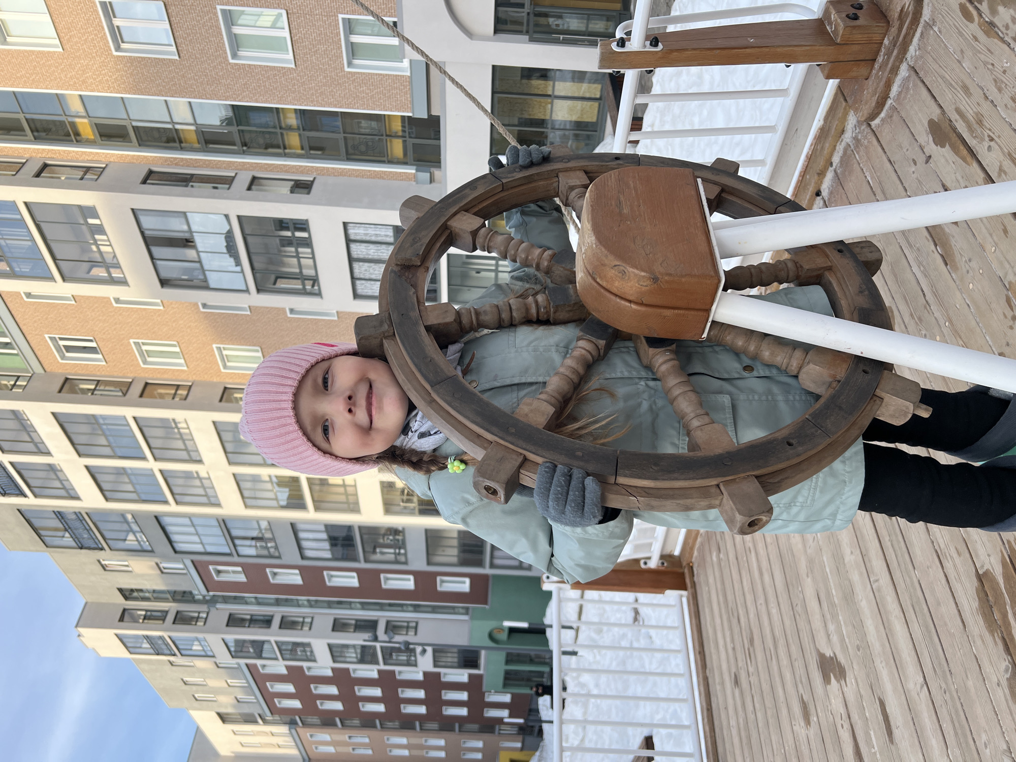 A young female child, wearing a pink knitted beanie, a light green winter jacket, dark grey gloves, black pants, and dark grey boots, stands on a light brown wooden plank deck. She is actively gripping a large, dark brown wooden ship's wheel with both gloved hands and smiling towards the camera. The ship's wheel is mounted on a lighter wooden base, supported by two white vertical poles. White metal railings border the wooden deck. Beyond the railings and deck, patches of snow are visible on the ground. In the background, several modern multi-story residential buildings with diverse facades in light grey, beige, and reddish-brown tones, featuring numerous windows and some balconies, rise under a clear blue sky. A thick, light-colored rope is partially visible on the right, attached to a wooden post. The scene is set outdoors in a residential complex in Pervomaysky, Russia.