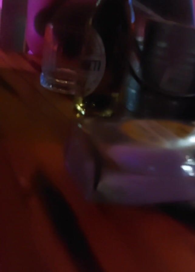 The video depicts a dimly lit bar scene with a wooden countertop cluttered with various items