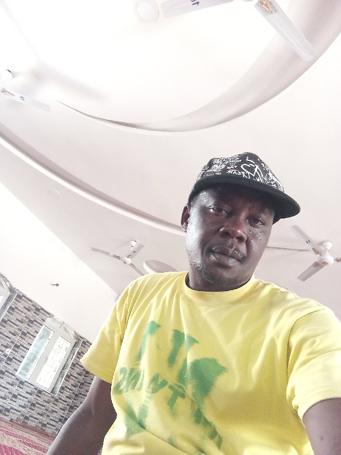 A forensic examination of the image reveals an adult male, likely positioned for a selfie, in an indoor environment in Lokoja, Nigeria. The subject, of dark complexion, wears a black baseball cap adorned with white scribbled patterns and a yellow t-shirt featuring a faded green graphic print on the front. Visible stubble covers his face, and he maintains a direct gaze towards the camera. The background consists of a predominantly white ceiling with intricate, curved, and layered architectural detailing. Multiple white ceiling fans with light-colored blades are mounted on the ceiling, indicating an artificial air circulation system. To the left of the subject, a wall section is visible, covered with rectangular tiles in shades of brown and possibly grey, arranged horizontally. A white-framed window, appearing to be either double-pane or featuring an arched top, is integrated into this tiled wall. A portion of a reddish, patterned rug or carpet is discernible on the floor in the lower left foreground, beneath the tiled wall. The overall lighting is bright, illuminating the scene.