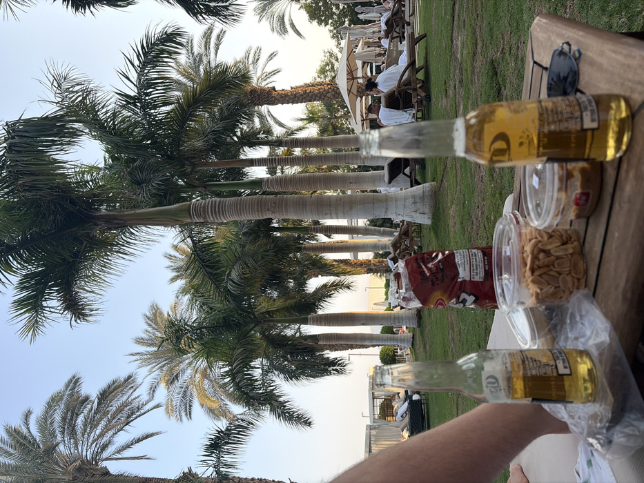 The scene depicts a resort or hotel garden area within the Tamar Regional Council, Israel, observed during late afternoon or early evening. In the foreground, a wooden surface supports two light-amber liquid-filled clear glass bottles, a clear plastic container of peanuts, a smaller clear plastic container, a crumpled clear plastic bag, and dark sunglasses. A portion of a bare human leg is visible on the left. The midground features a manicured green grass lawn with a red bag of chips displaying Hebrew text. Numerous tall palm trees with light-colored, ringed trunks and green fronds are systematically arranged across the landscape. In the background, several individuals are seen relaxing on white lounge chairs and sunbeds; two individuals on the right wear white robes while seated under a white umbrella. The sky is clear and light blue.