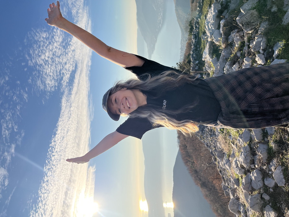A young woman with outstretched arms stands on a rocky incline against a bright sky with wispy clouds. She wears a black t-shirt, a plaid shirt tied around her waist, and a cap. The sun shines in the distance, reflecting off a body of water, possibly a bay or lake. A mountain range is visible in the background, partially obscured by haze. The woman smiles towards the viewer. The photograph appears to be taken from a slightly tilted angle.