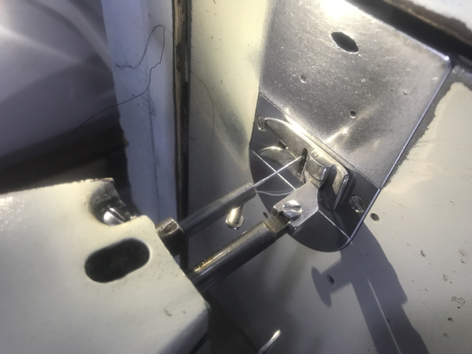 A close-up, high-angle view captures the needle and presser foot assembly of an industrial sewing machine, located in Jos, Nigeria. The metallic silver-colored presser foot, secured by a screw, rests on a matching metallic throat plate which exhibits minor scratches and wear. A thin white thread is visibly threaded through the needle, crossing over the presser foot's front portion. The upper portion of the machine, light grey in color, is partially visible, showing a dark, irregularly shaped aperture on its left side. In the background, a distinct, wavy black fiber rests on a lighter, slightly reflective surface, possibly part of the machine bed or surrounding workbench. Shadows are cast by the machine components, indicating a light source from the upper left. No human presence is depicted.
