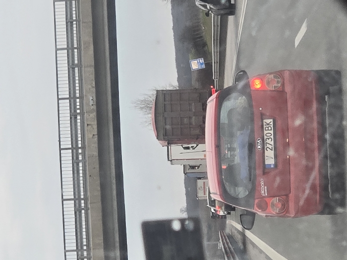 The image displays a multi-lane highway with stationary or slow-moving traffic under an overcast sky, observed from within a vehicle. Directly in front is the rear of a red 5-door Kia Picanto with Bulgarian license plate Y 2730 BK, its left rear taillight illuminated. Behind the Kia, a dark brown dump truck is visible, followed by a queue of other vehicles including white semi-trailer trucks and passenger cars. A concrete overpass with a silver metal railing spans horizontally across the upper third of the frame. A blue and white informational sign is present on the right shoulder of the road. The roadside vegetation consists of sparse, bare trees and shrubs, with distant hills visible under the grey sky. This scene is located on a major highway in the general vicinity of Plodovitovo, Bulgaria.
