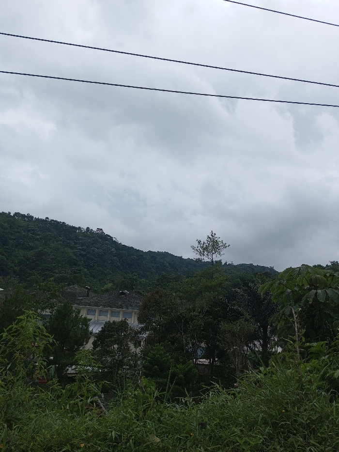 The image depicts a verdant landscape in Ambakirano, Madagascar, under an overcast sky composed of light grey clouds. Two dark, parallel power lines are visible horizontally across the upper quarter of the frame. A heavily forested mountain range, dense with green foliage, forms the background. In the mid-ground, partially obscured by various trees and dense vegetation, is a multi-story building with a light-colored exterior, a multi-paneled tiled roof, and several rectangular windows. Two chimney-like structures are present on the building's roof. The foreground is occupied by lush green vegetation, including tall grasses and bushes. No individuals, animals, or active events are discernible within the frame.