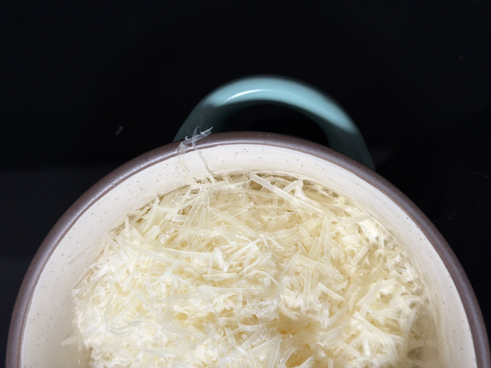 - "A close-up, top-down shot shows a light-colored bowl filled with shredded cheese" by FM-9RY2s2, licensed under CC BY 4.0