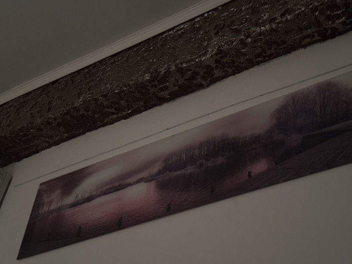 The scene depicts an interior space within an unspecified building in Unknown, Unknown. A large, horizontal panoramic print is mounted on a light-colored wall, filling the lower two-thirds of the image frame. The print illustrates a serene landscape featuring a body of still water reflecting a hazy sky with reddish-pink and purple hues, indicative of a sunrise or sunset. Bare trees and dense, dark foliage line the distant bank of the water. Several dark, vertical posts or stumps are partially submerged in the foreground water. A thin, light-colored cable runs horizontally across the wall just above the print. Directly above this cable, a heavily textured, dark brown or bronze-colored decorative beam or molding is affixed to the wall at its junction with a light-colored ceiling, separated by a thin white trim. No individuals are present, and no actions or interactions are depicted.