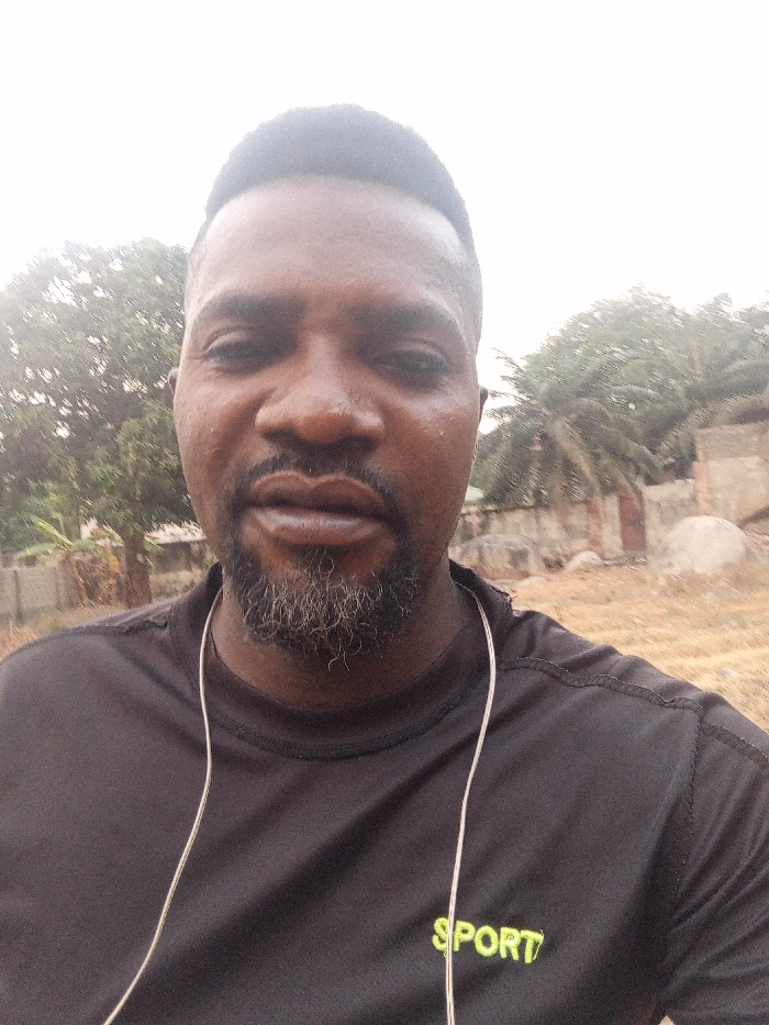 A head-and-shoulders outdoor shot features a dark-skinned man wearing a black athletic shirt with "SPORT" in bright yellow letters