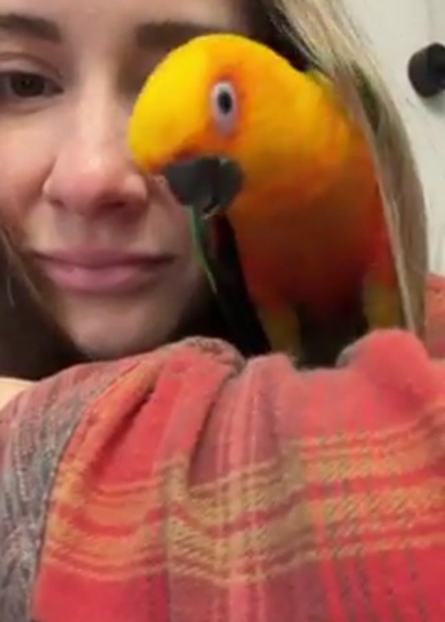 A woman with light skin and long light-brown hair is holding a small, colorful bird on her shoulder
