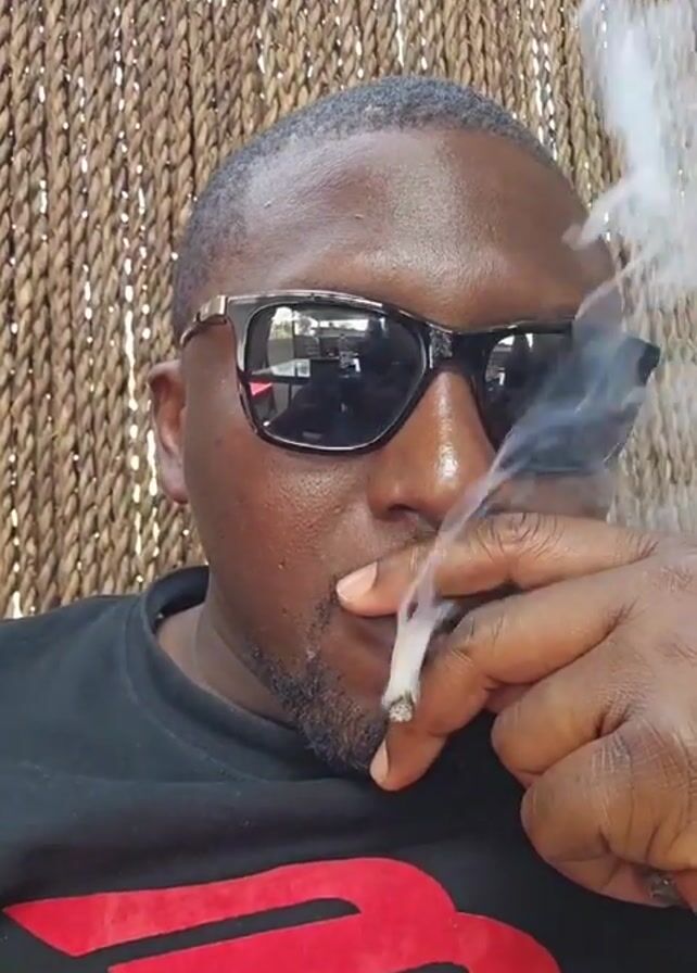 An African-American man wearing sunglasses and a black t-shirt with a large red graphic is smoking a hand-rolled cigarette. He is facing the camera, and smoke can be seen rising from the cigarette. The background appears to be a woven reed or thatch fence. The man has a short haircut and a goatee.