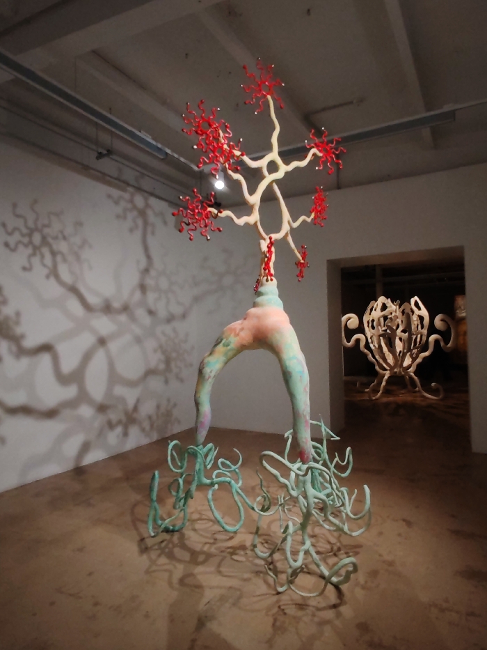 An abstract, multi-part sculpture is positioned centrally within an interior exhibition space in Riga, Latvia. The primary sculpture features a light beige, branched structure forming an upper canopy, from which numerous clusters of small, wavy, red, coral-like elements with white tips extend. This upper section is supported by a thick, arched, tubular mid-section displaying mottled pastel shades of light blue, pink, and green. The base of the sculpture consists of a dense arrangement of light turquoise, irregular, looping, root-like forms spread across the light brown floor. Overhead artificial lighting casts prominent, intricate shadows of the sculpture's branching and root patterns onto the plain white wall to the left and the floor. An open doorway in the right background reveals a portion of an adjacent room, where a second, larger, light-colored, ornate, and abstract sculpture with scroll-like elements is partially visible. No individuals or active interactions are present in the scene.