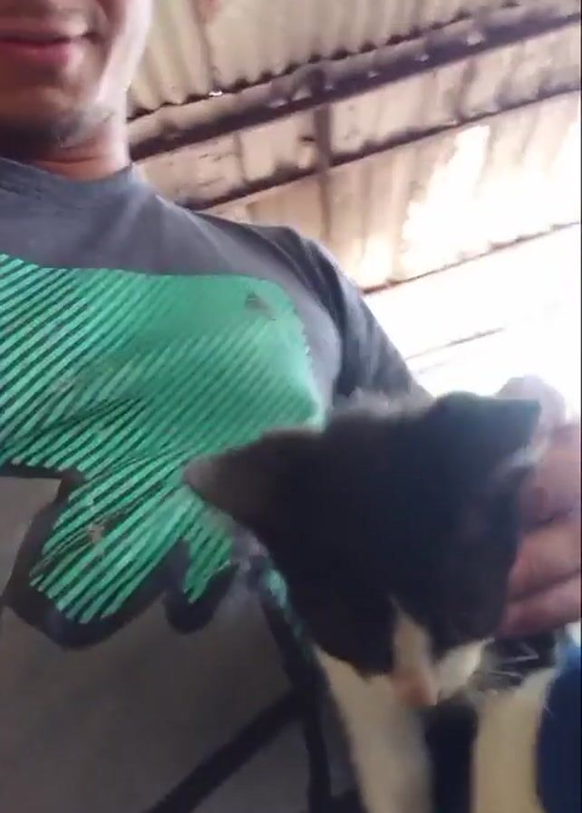A man is holding a black and white kitten. He is petting the kitten on his shoulder. The man is wearing a gray t-shirt with green stripes. The kitten is small and has a white nose. There is a dog visible in the background, laying on the floor. The setting appears to be an outdoor covered area, possibly a shed or porch, with a corrugated metal roof.