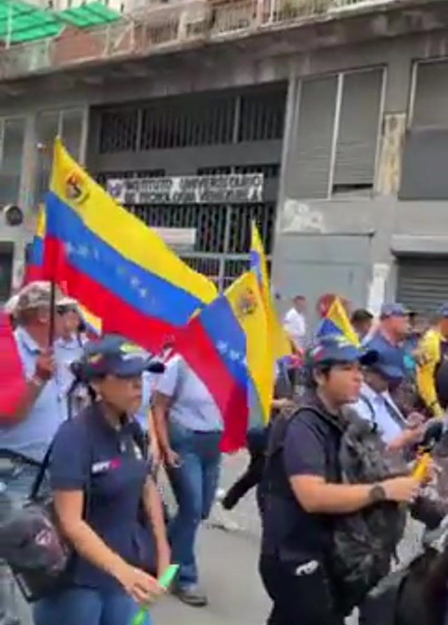 A group of people, mostly wearing light blue shirts and dark blue jackets and caps, are walking down a city street, waving Venezuelan flags