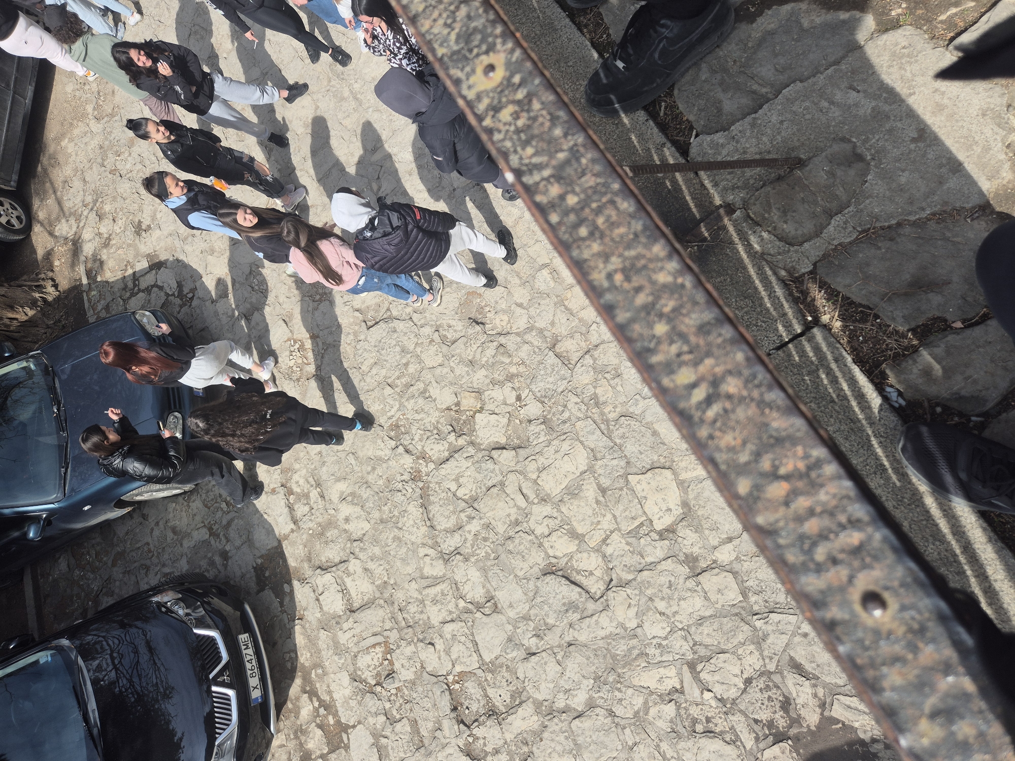 This image, captured from an elevated perspective in Veliko Tarnovo, Bulgaria, depicts a group of approximately 15-20 young individuals gathered on a stone-cobbled street or plaza. The scene features a paved surface composed of irregularly shaped, light-colored flagstones under direct sunlight, casting distinct shadows. Two vehicles are parked on the left side of the frame: a black Mitsubishi sedan, displaying Bulgarian license plate "X 8647 ME," and a partially visible dark blue Volkswagen Golf-like hatchback. Sparse, bare tree branches and dry ground vegetation are discernible in the background and near the parked cars. The individuals, primarily females, are dressed in casual attire, including various jackets, hoodies, sweatpants, and jeans. They are distributed in small clusters. Actions observed include standing, walking, and conversing. One female in a black puffer jacket near the blue car holds a small white object, possibly a cigarette, in her right hand and a smartphone in her left. Another female holds an orange beverage cup. Several individuals are seen smiling or laughing while interacting. In the immediate foreground, a rusty, dark metal railing with a visible rivet traverses horizontally, partially obscuring the view below it, where a small area of ground with irregular stones, dirt, and a protruding metal rebar is visible. Two pairs of feet in black sneakers are visible at the bottom right, suggesting the vantage point of the photographer.