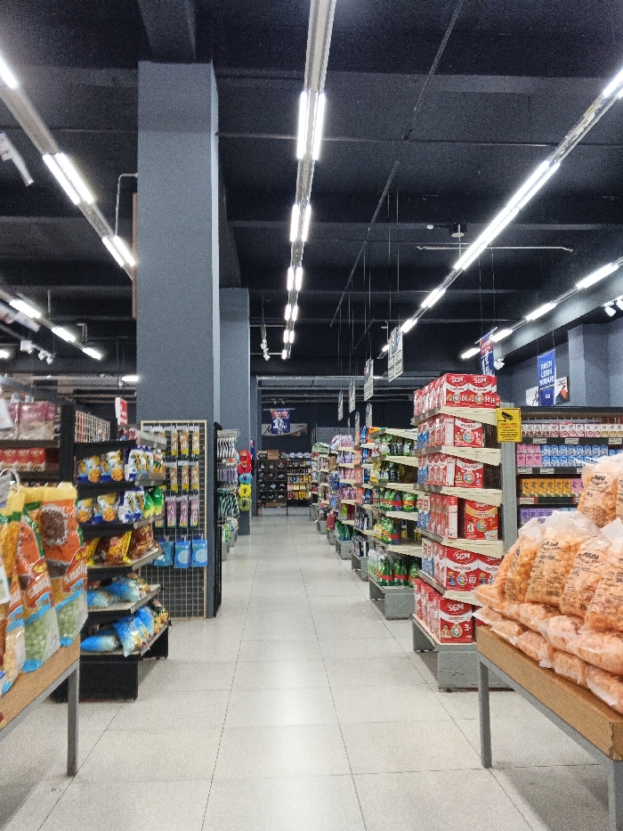 Inside a supermarket, rows of shelves stretch down an aisle, stocked with various goods. On the left, chips and snacks are displayed. The right features stacks of SGM products and bags of snacks. Overhead, fluorescent lights illuminate the scene. Gray pillars support the ceiling. Tiled flooring runs the length of the aisle.