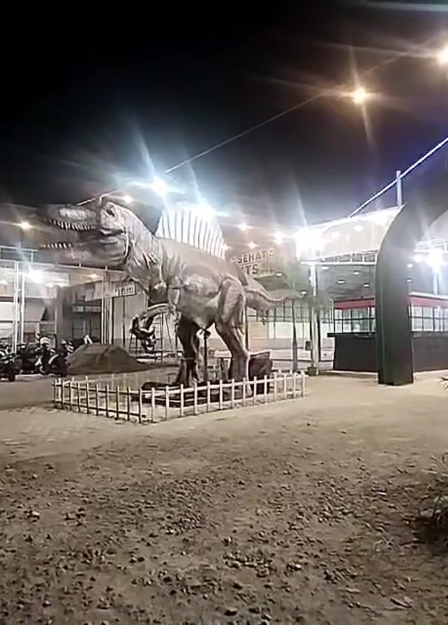 large dinosaur statue, possibly a Spinosaurus, standing on a small mound surrounded by a low wooden fence. It appears to be nighttime, with several bright lights illuminating the statue. Behind the statue, there's a building with a sign that appears to say "SEHAT", partially obscured. Some motorbikes are parked to the left of the statue. The ground around the dinosaur is dirt and sparse vegetation is visible in the foreground. The scene gives the impression of a commercial or recreational area.