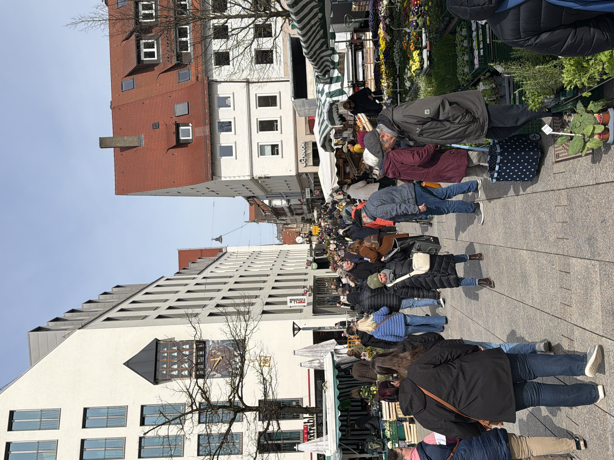 This image captures a bustling open-air market scene on Marktplatz in Ulm, Germany, under a clear blue sky. The perspective is looking north along a wide, stone-paved pedestrian street. To the left, a modern, multi-story building with a white facade features numerous vertical rectangular windows. On its upper facade, a distinctive clock with a golden face and dark hands is visible, positioned below a black, pointed structure housing multiple small, light-colored bells, suggesting a glockenspiel. Below the clock, a sign for "CAFÉ EXTRABLATT" is present. Bare deciduous tree branches partially frame this building. Market stalls with green and white striped awnings extend along the left side of the street, displaying produce in wooden crates. To the right, a row of older, multi-story buildings with light-colored facades and prominent red-tiled pitched roofs is visible. Several dormer windows and a grey chimney are apparent on the roofs. Further down, a sign for "Scheuble" is on one of these buildings. Market stalls also line the right side of the street, predominantly showcasing a variety of potted plants, herbs, and colorful flowers arranged on tables and in crates. A white cargo truck is positioned behind some of these stalls. The stone-slab-paved street is densely populated with a diverse crowd of individuals. People are observed walking, standing, and browsing the merchandise. They are dressed in casual, warm attire, including jackets and coats. A blue polka-dotted rolling shopping cart and various shoulder bags are visible among the crowd. Strong sunlight illuminates the scene, casting distinct shadows.