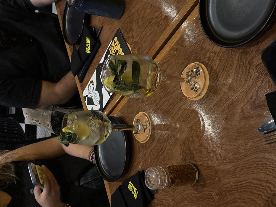 Two stemmed glasses filled with drinks, including lemon slices and mint leaves, are placed on a wooden table. A jar of chili flakes, black napkins, and black plates surround the glasses. People are seated at the table; one person is holding a small, silver object. The restaurant's branding is visible on the napkins and the bottom of the glasses.