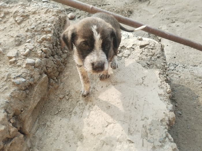 A brown and white puppy stands on cracked concrete in the foreground. The puppy has droopy ears and is facing forward. A dirt bank with small rocks is behind it, and a rusted metal pole runs horizontally across the top of the image. The background is blurry and light brown. The puppy's shadow falls to its right.