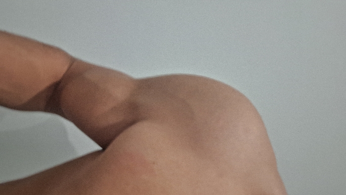 - "The image displays a close-up, waist-up view of a person's bare right shoulder and upper arm against a plain, light grey wall" by FM-bHJRf2, licensed under CC BY 4.0