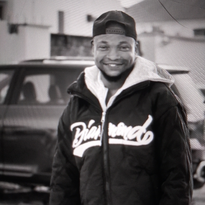 A person with a cap smiles, wearing a black jacket with white writing "Diamond" across the front. The jacket also features a white hood. Behind the person is a blurry image of a vehicle and what appears to be a building in the background. The image is in black and white and has some minor imperfections, like a crack on the upper right corner. The overall composition is a casual portrait.
