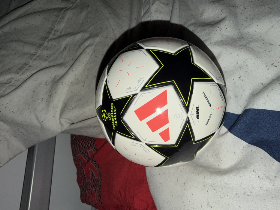 - "A white, black, and red Adidas "MINI REPLICA MATCHBALL" football, bearing the UEFA Champions League logo and multiple "2024" markings, rests on a light-colored, speckled fabric surface" by FM-3xcpI3, licensed under CC BY 4.0