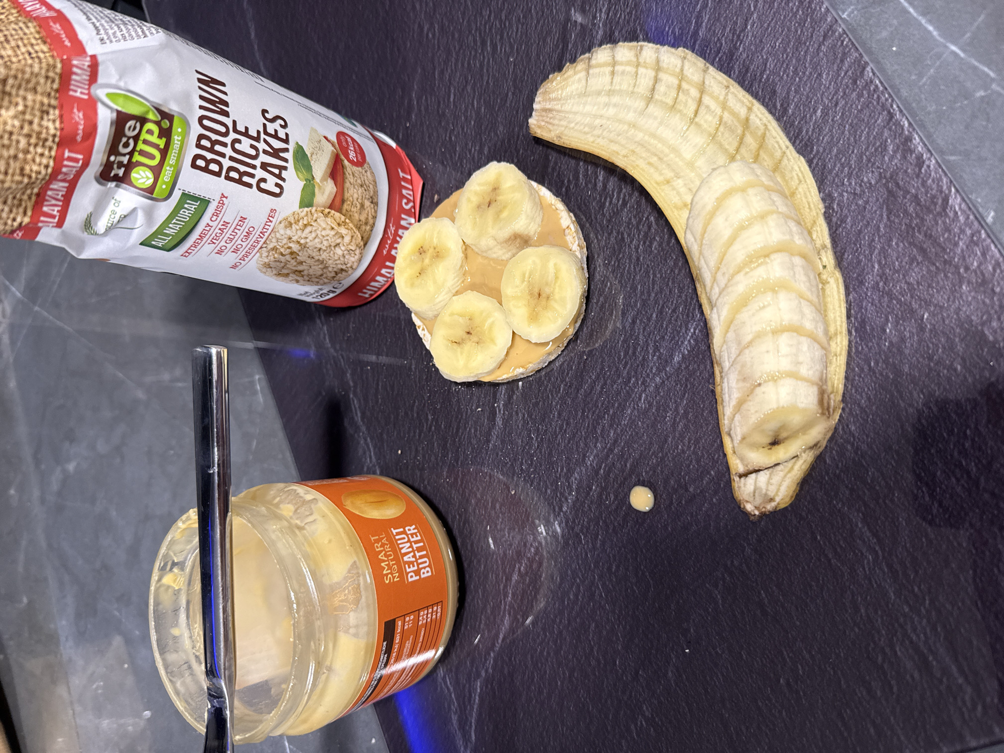 The scene, located in Burgas, Bulgaria, displays food items arranged on a dark, textured surface. A partially full clear glass jar of "SMART NATURal PEANUT BUTTER" is positioned on the left, with a silver metal knife resting horizontally across its opening. To the right and slightly behind the jar, a white and red bag labeled "rice UP! BROWN RICE CAKES with HIMALAYAN SALT" stands upright. In the foreground, a single round brown rice cake is topped with a layer of peanut butter and four distinct slices of banana. Adjacent to the rice cake, a partially peeled banana lies horizontally; its yellow peel is visible, and the peeled section reveals several banana slices still attached. A small, yellowish droplet, consistent with peanut butter, is visible on the dark surface between the peanut butter jar and the banana.