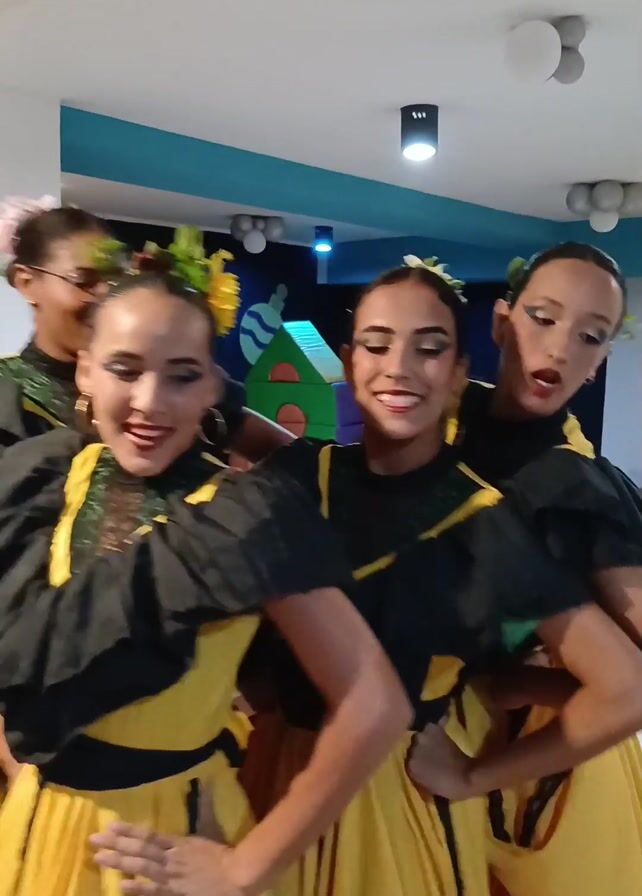 Four women in traditional dance costumes are practicing their routine in a room. They are wearing yellow skirts with black tops and floral headpieces, and appear to be enjoying themselves. One woman is wearing glasses. The room is decorated with balloons and a children’s playhouse. The lighting is bright, and music is playing in the background.