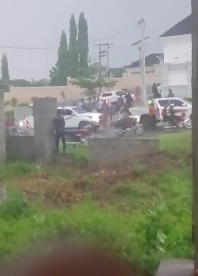 street scene in a residential area. There is a police car with flashing lights parked on the street, surrounded by a group of people. There are also a few motorcycles and cars parked nearby. The environment appears to be a grassy area in front of a building. The overall atmosphere seems tense due to the presence of the police and the gathering of people.