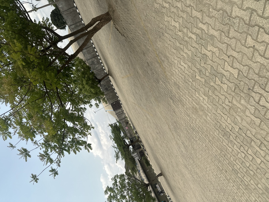 The image displays an expansive outdoor area located in Ozuaha, Nigeria. The ground surface consists entirely of grey interlocking concrete pavers, exhibiting faint, faded yellow lines suggesting parking space delineation. A clear blue sky with scattered white clouds occupies the upper portion of the frame. Several trees with green foliage are present; a prominent tree with multiple trunks stands in the mid-ground to the right, while other trees are situated in the mid-ground and background. In the background, a grey concrete perimeter wall is visible, topped with distinct black and white striped sections. Behind this wall, various structures are discernible, including a large building with a sloped roof towards the right and additional buildings to the left. A solitary, indistinct individual is observed standing or walking in the far left mid-ground, near a structure. No specific actions or interactions are clearly depicted.