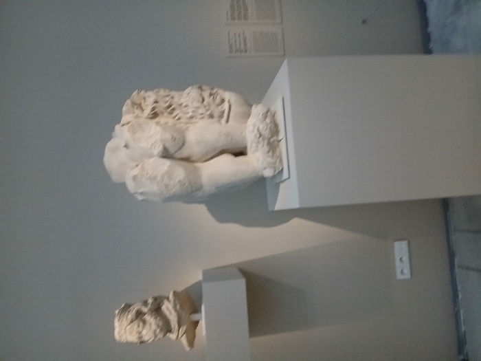 The image displays an interior view of a museum exhibition space within the Louvre-Lens museum in Lens, France. Two white marble sculptures are positioned against a plain, light grey wall. In the foreground, positioned right of center, a large, fragmented marble torso of a human figure is displayed. This sculpture, exhibiting visible musculature and a textured element resembling drapery or animal hide on its left side, rests on a light-colored square base atop a tall, rectangular light grey pedestal. Further back and to the left, a smaller white marble bust, depicting a head with wavy hair and partial shoulders, is exhibited on a shorter, rectangular light grey pedestal. The wall behind the exhibits features two rectangular, text-bearing information plaques on the right side, adjacent to the larger sculpture, and a white dual-socket electrical outlet positioned lower on the wall to the left of the larger pedestal. The floor consists of light grey tiles or slabs. No individuals are present in the frame. The scene is illuminated by uniform overhead lighting.