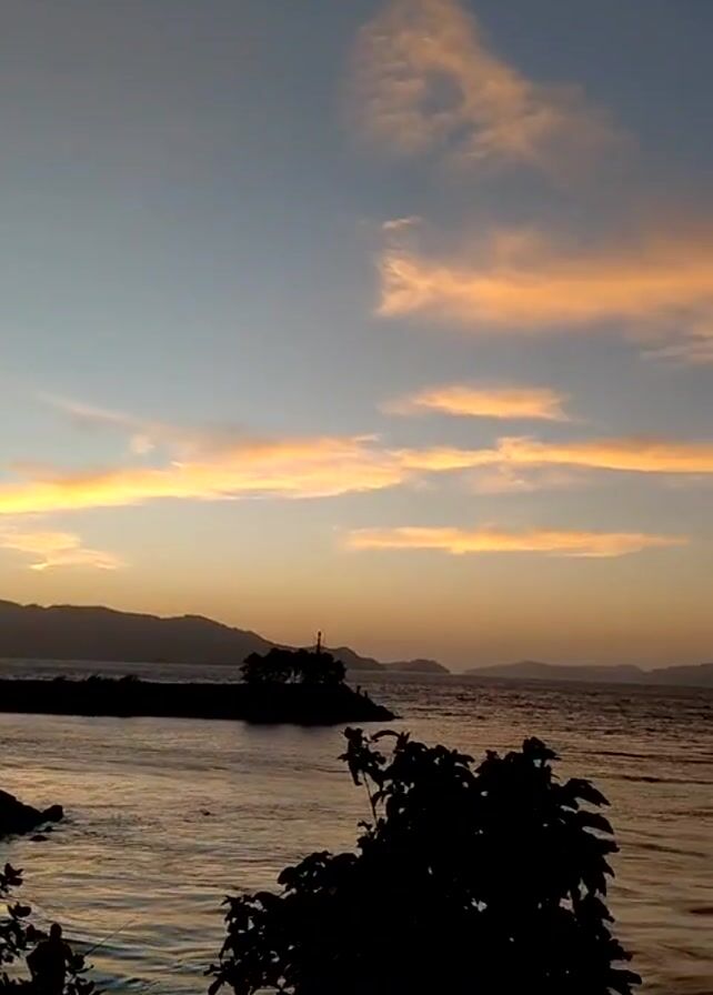 body of water, likely a sea or ocean, at sunset. A silhouetted figure is visible in the foreground, possibly fishing. Silhouetted landmasses are present in the distance. The sky displays hues of blue, orange, and pink, with cloud formations. As the video progresses, the sky darkens, and the colors intensify.