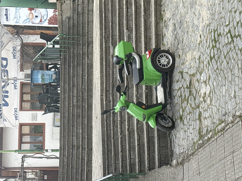 - "The scene in Strelcha, Bulgaria, depicts a bright green three-wheeled electric scooter parked on a grey cobblestone surface at the base of a wide, multi-tiered stone staircase" by FM-F6F9k1, licensed under CC BY 4.0