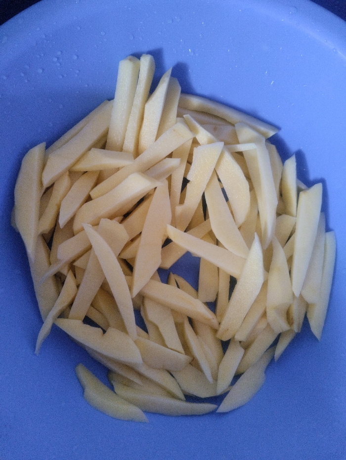 - "A close-up overhead shot displays a quantity of raw potatoes, cut into irregular, elongated pieces resembling french fries, occupying the center of a blue plastic basin" by FM-ceYJN2, licensed under CC BY 4.0