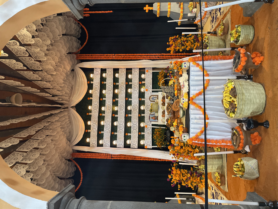A colorful altar is set up for Dia de los Muertos. Paper cutouts decorate the ceiling. Rows of lights accent a backdrop. Offerings, including fruit-filled baskets, flowers, and decorative skulls, are arranged on the altar. An orange marigold garland adds vibrancy. Festive, reverent, and culturally rich, the setting honors deceased loved ones.