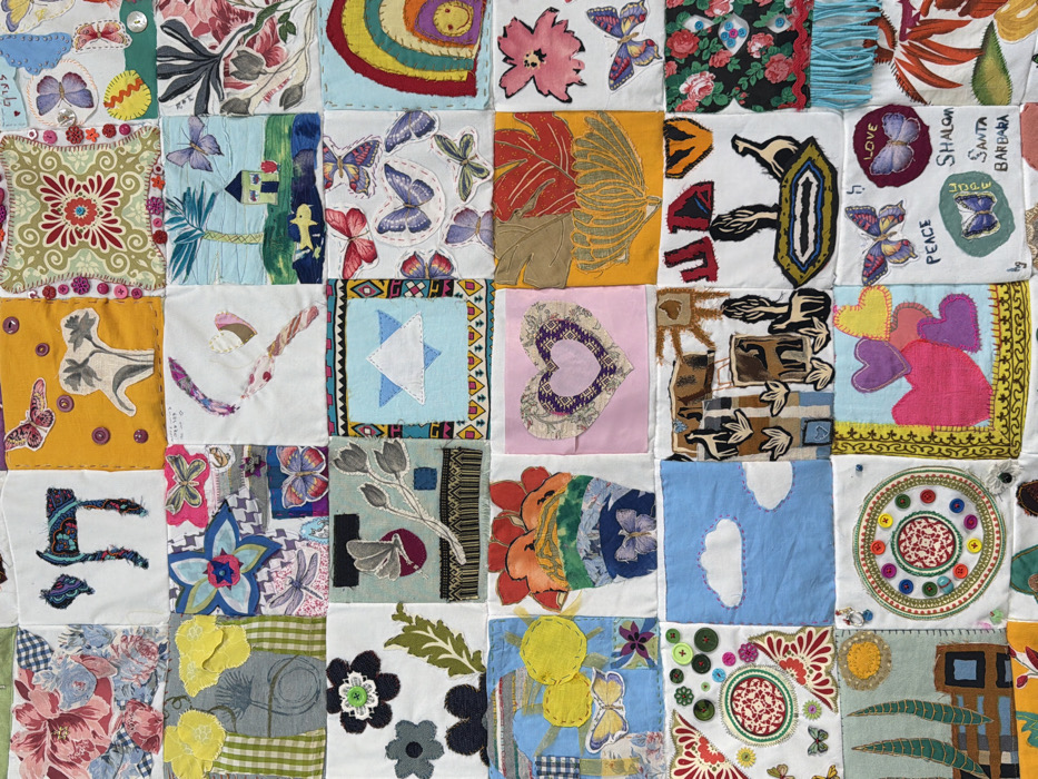 This image presents a textile art quilt composed of multiple square fabric patches sewn together in a grid pattern. Each patch features unique designs crafted through various techniques including applique, embroidery, and fabric painting. Dominant motifs across the quilt include numerous butterflies, hearts, diverse floral patterns, and elements of nature. Several squares incorporate distinct Jewish symbols, such as the Hebrew letter "Chai" (חי) and the Star of David. Textual elements are visible on some patches, including "PEACE," "Shalom," "LOVE," "Santa Barbara," and additional Hebrew script. Other notable designs include rainbows, abstract patterns, a depiction of a palm tree and a house, and squares adorned with decorative buttons and fringe. The quilt is characterized by a vibrant and diverse color palette. This textile artifact is located in the Shaar HaNegev Regional Council, Israel.