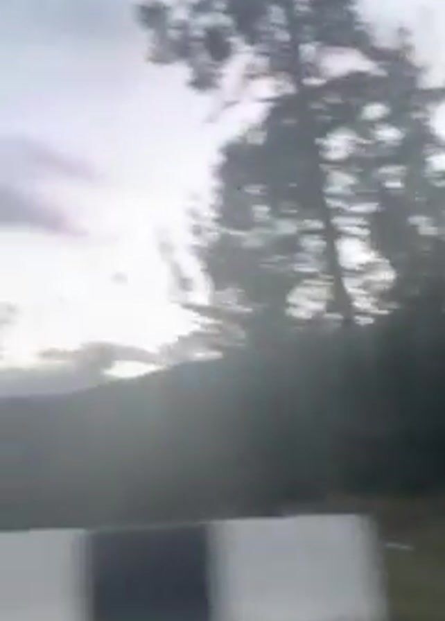 view from a moving vehicle. Trees and a hillside covered in vegetation pass by. The sky is overcast with clouds. The camera is shaky. A portion of a concrete barrier is visible at the bottom of the frame. Sounds of people talking can be heard.