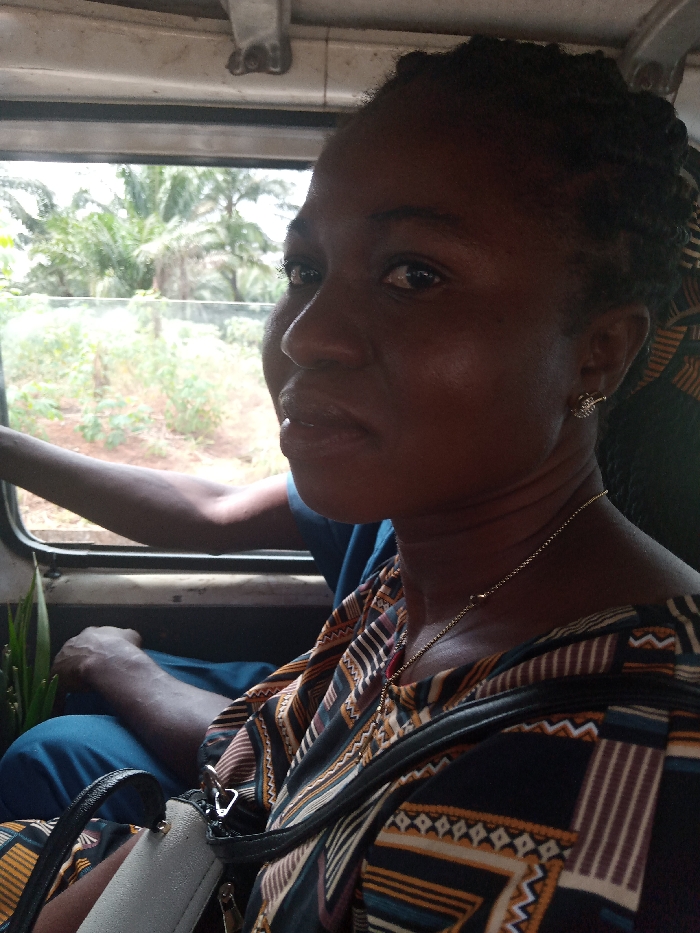 The image depicts an adult female inside a vehicle in Okpatu-Ukehe, Nigeria