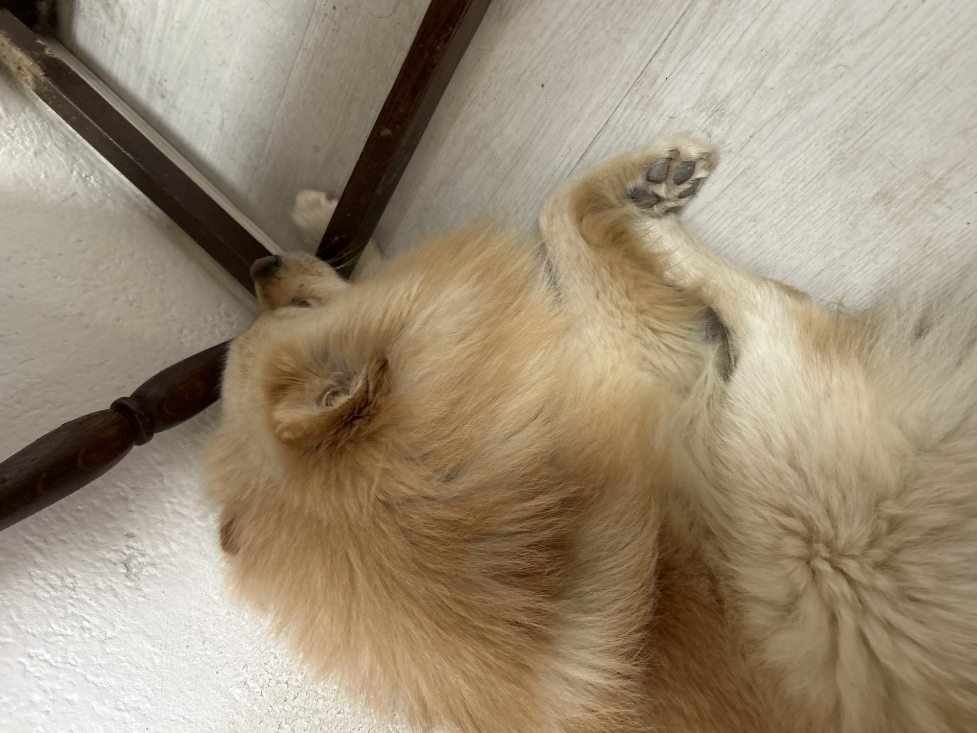 An indoor scene in Varshets, Bulgaria, features a light brown, fluffy-coated dog lying on its left side on a light-colored wooden plank floor. The dog's head rests against a dark brown, worn wooden furniture leg or frame, positioned diagonally from the upper right toward the center. One of the dog's front paws, revealing dark paw pads, is visible. A white, textured wall is present in the upper left background. The dog appears to be sleeping.
