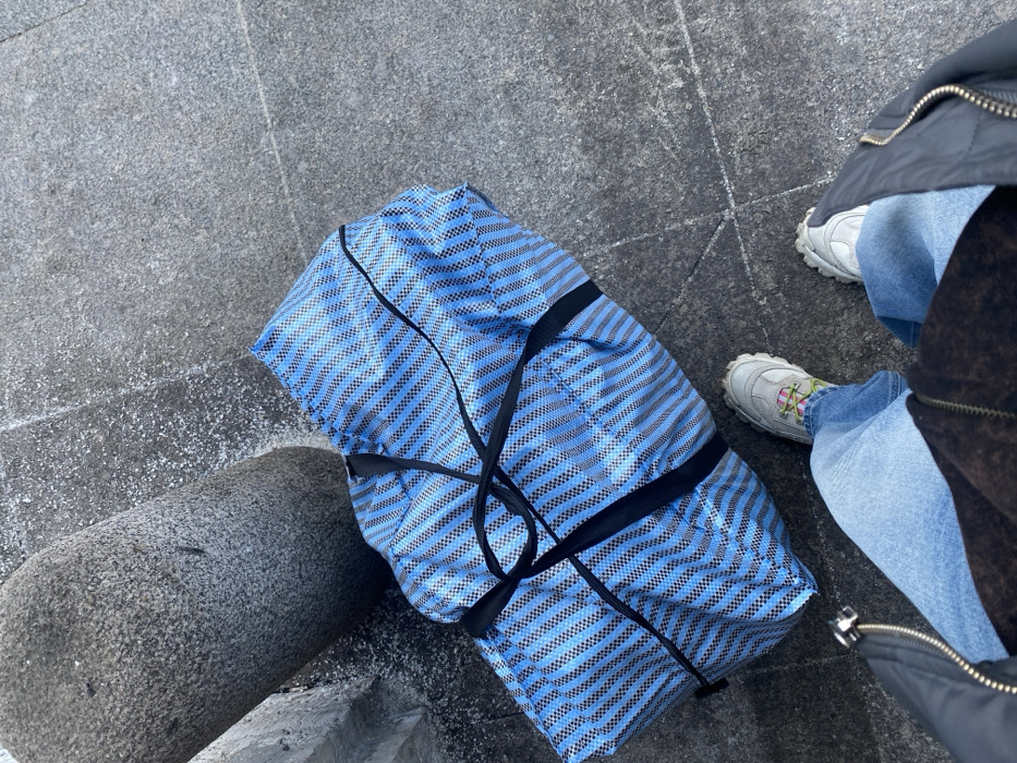 A high-angle, forensic view captures the lower body of an individual standing on a textured grey stone pavement in Saint Petersburg, Russia. A large, rectangular blue woven bag with black diagonal stripes and black carrying straps, some tied over the top, rests directly in front of the person. To the upper left, a grey cylindrical concrete bollard is partially visible. The individual wears light blue denim jeans, a dark jacket with a visible metallic zipper, and light grey athletic sneakers; the visible left shoe features multi-colored laces. The pavement exhibits faint white lines or scuff marks.