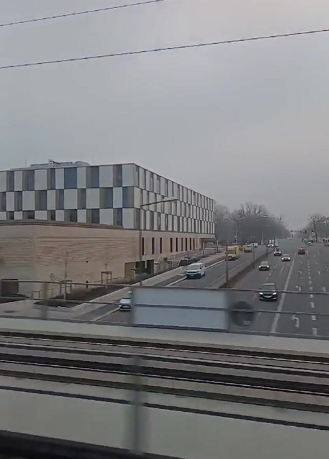 view from a moving train. Outside the window is a multilane road with cars, next to a building with a checkered pattern on its facade. Beyond the road are trees and other buildings, viewed under an overcast sky. The train tracks are in the foreground.