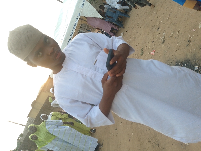 A man in a white robe and a beige cap stands in a sandy area, holding a dark object, possibly a phone. He looks directly at the camera. Behind him are other individuals and a white tent. Some people in the background are wearing green and white patterned outfits. The scene appears to be outdoors, possibly at an event or gathering.