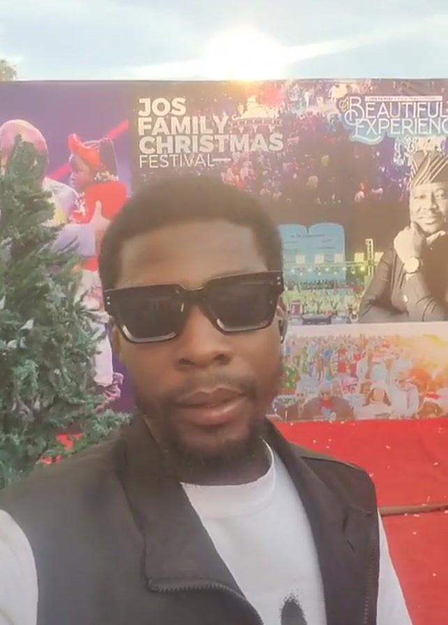 man in sunglasses standing in front of a large sign for the "JOS FAMILY CHRISTMAS FESTIVAL