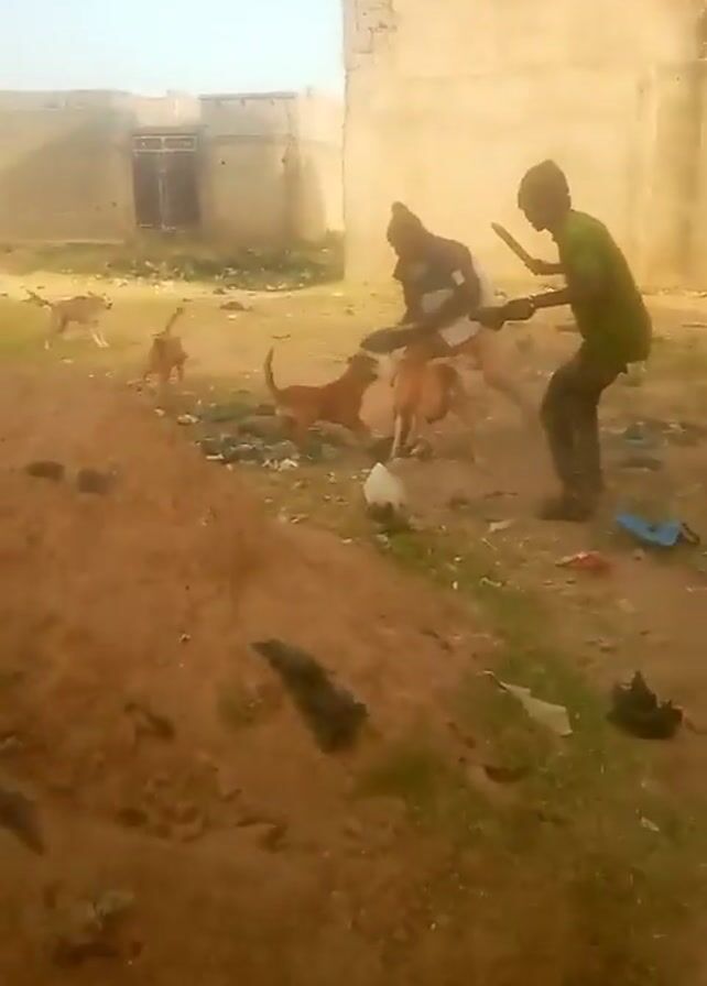 two men chasing a group of four brown dogs. The dogs are running away from the men in an outdoor area with dirt, grass, and trash scattered around. There are brick buildings in the background under a bright sky. One of the men is wearing a green shirt and dark pants, while the other is wearing a white shirt and brown pants. The dogs are barking and running quickly.
