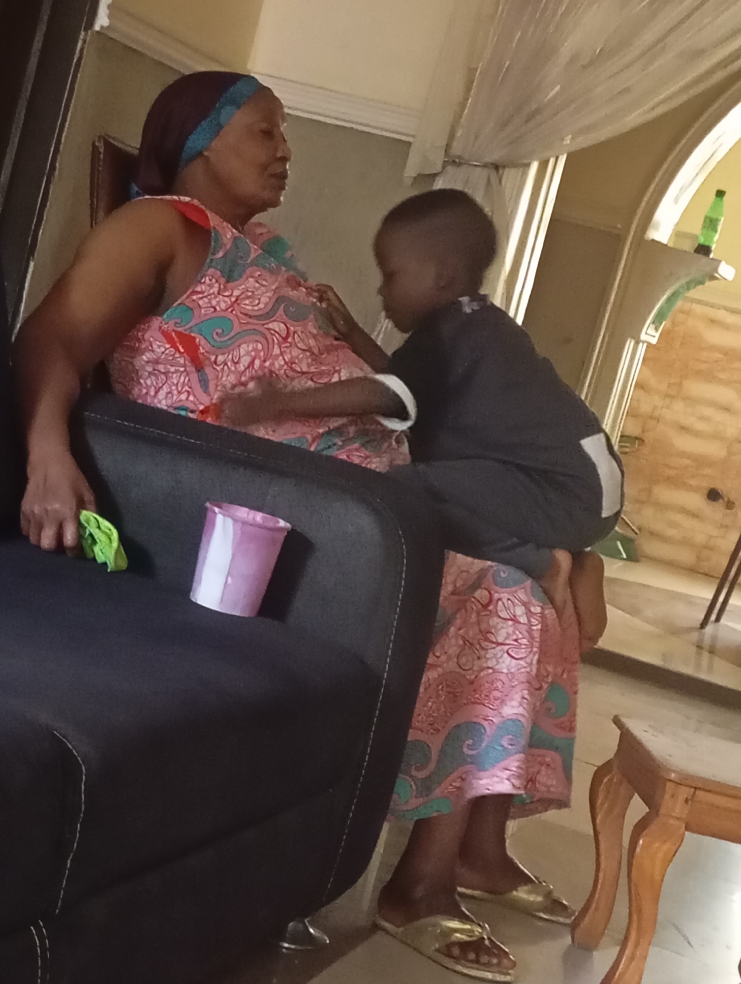 The image depicts an indoor residential setting in the city of Unknown, Unknown. An adult female with dark skin, wearing a patterned sleeveless dress (pink, blue-green, white, red design) and a dark head covering with a light blue-green band, is seated on a dark upholstered sofa. She wears gold slide sandals. Her right arm rests on the sofa armrest, holding a crumpled light green cloth. A light pink plastic cup with a white vertical stripe is positioned on the sofa next to her right thigh. A young child, with dark skin, wearing a dark long-sleeved top with white cuffs and a white rectangular patch on the back, is seated on the adult female's lap, facing left. The child is barefoot, with hands near the adult's upper chest/shoulder area. In the background, an arched architectural feature is visible, along with white sheer fabric draped from the ceiling. A green bottle is placed on a ledge within the arched structure. A light brown wooden side table with carved legs is partially visible in the lower right foreground.