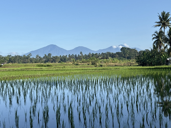 The image displays a rural agricultural landscape in Mas, Indonesia, under a clear, bright blue sky. In the foreground, a flooded rice paddy field features young, green rice shoots arranged in vertical rows, their reflections distinctly visible in the calm water. A narrow, raised earthen dike or path runs horizontally across the midground, separating the foreground paddy from another, slightly more mature green rice field beyond. A dense line of tropical trees, including numerous tall palm trees, forms a verdant backdrop in the midground. In the far background, a range of prominent blue mountains extends across the horizon, with small white clouds partially obscuring some peaks on the right. On the far right of the frame, a cluster of large palm trees and thick green undergrowth is present, partially concealing a small, white, indistinct structure. No individuals, animals, or discernible actions are depicted within the scene.